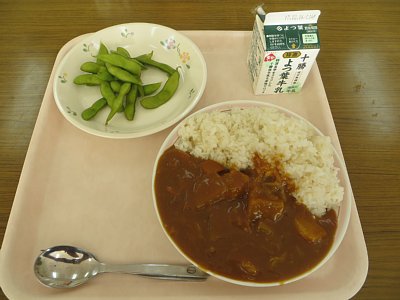付け合せには枝豆が。そのままもぐもぐと食べるのはもちろん、中には枝豆の粒をさやから出して、カレーと混ぜて食べている子も。味わい方も人それぞれですね。