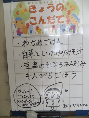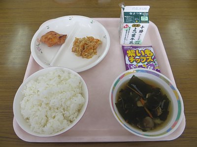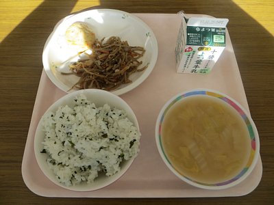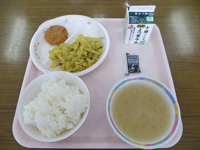わかめごはん 白菜としいたけのみそ汁 豆腐のそぼろあん包み きんぴらごぼう 牛乳