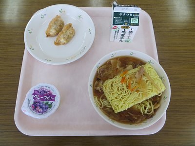 ちゃんぽん風ラーメン ひじきぎょうざ グレープゼリー 牛乳