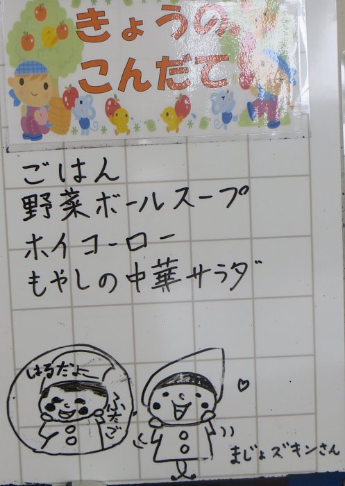 サラダはもやしの中華サラダ。あとから中華ドレッシングをかけて食べます。このドレッシング、加減して書けないとお皿に残ってしまうのですが、その残ったドレッシングに、ご飯を浸して食べている子も…。