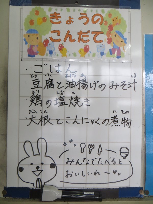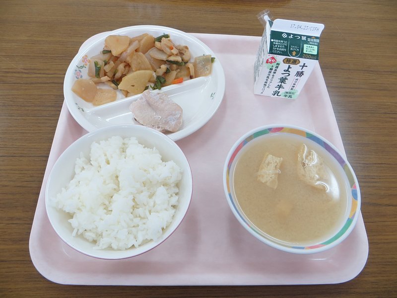おかずには鶏の塩焼き。昨日から一緒に給食を食べている1年生にとってはちょっと硬くて食べづらかったようですが、がんばって食べていたようです。