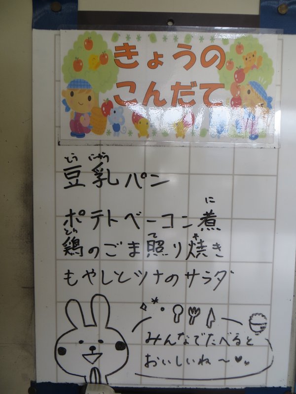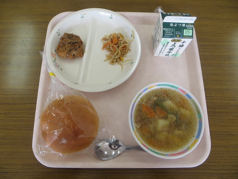 汁物はポテトベーコン煮。ベーコンの香ばしい香りと、イモの甘みねっとりとした食感がブイヨンと醤油ベースのスープによく合います!1年生の子は、パンをスープに浸して、そのしみ込んだスープをちゅーちゅー吸いながら食べていました。