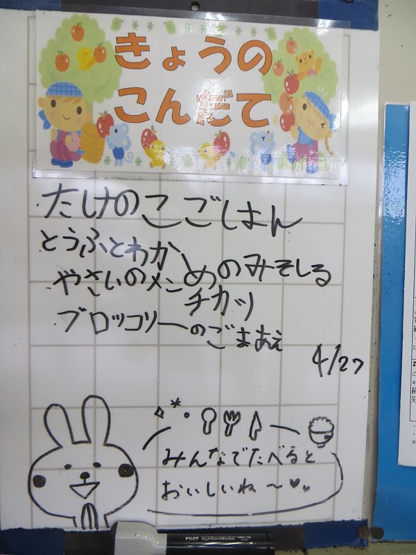 今日のご飯はたけのこご飯!しゃきしゃきした歯触りのたけのこがたっぷり入っていました。1年生の女の子2名が、ご飯に入っているつきこんにゃくをみて「これな~に?」と言っていました。「こんにゃくだよ」と教えると、「ふ~ん」となんだか納得したような納得していないような顔をしながら食べていました(^^;。こんにゃくというと、プルンとしたあの大きな塊を思い浮かべていたのかもしれませんね。
