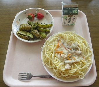 今日は金曜、麺の日です!今日のメニューはクリームパスタ!つるつるで歯ごたえの良いパスタに生クリームたっぷりのソースをかけていただきます。隠し味はみそなんだとか…?クリーミーで美味しいパスタでした!