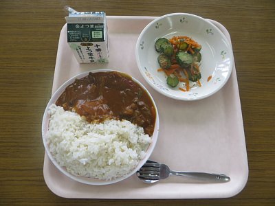 今日はみんな大好きカレーの日!今日のカレーは夏野菜カレー!じゃがいも、玉ねぎ、豚肉に加え、さやいんげん、ピーマン、なすび、トマトが入ったスパイシーなカレーです。いつもは、ちゃくむが鳴っても食べ終わらずに食べ続けている子が数名いるのですが、今日は誰も居残りせずにチャイム前に全員食べ終わりました!やはりカレーは人気ですね!
