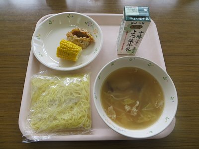 今日は金曜、麺の日です!今日のメニューは塩ラーメン!3・4校時と水泳学習を行った後ですので、温かいラーメンはありがたい…!美味しくいただきました。