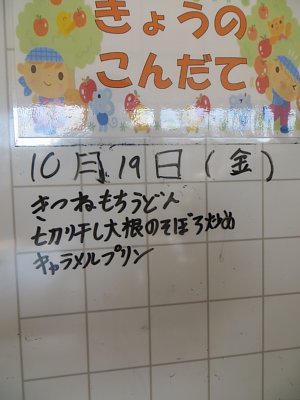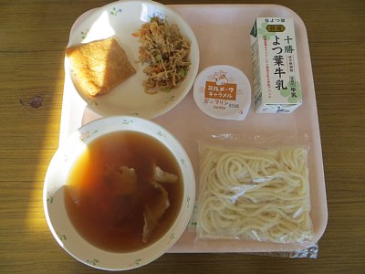 今日は金曜、麺の日です!今日のメニューはきつねうどん!甘じょっぱく煮られたお揚げの中にはやわらかとろ~りなお餅が入っています。つるっつるののど越しのうどんと美味しいおだし、そしてもち入りのお揚げが三位一体となって、とても美味しい一品となっています。