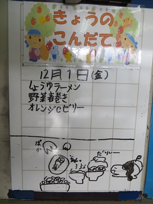 デザートにはオレンジゼリー。給食を食べる頃になっても芯の部分がまだシャリシャリのシャーベット状になっていて、今日の様な寒い日に食べるにはちょっと躊躇してしまいますが、食べると口の中に甘さと酸味が広がって、何とも幸せな気分に。ラーメンでちょっと脂っこくなった口の中がスッキリします!