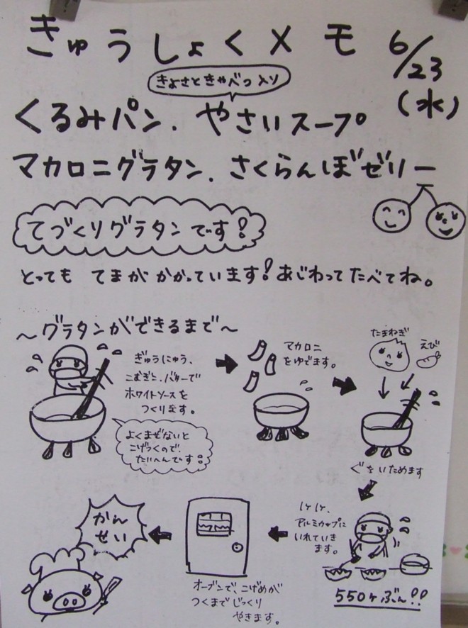 くるみパン 野菜スープ マカロニグラタン さくらんぼゼリー (687kcal) くるみパン はサイズが、小さめのためか、ほとんど残らなかったです。 野菜スープやマカロニグラタン、さくらんぼゼリーは、美味しかったです。 おかわりもすぐに無くなりました。 今日は、栄養教諭の先生が毎日出している 給食メモ を紹介します。 ↓↓↓↓ 文責:じゅん