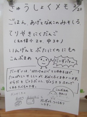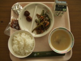 ごはん 揚げとなめこのみそ汁 照り焼き肉だんご いんげんと豚肉の煮物 こんぶ豆 インゲン豆 と こんぶ豆 が2種類でました。