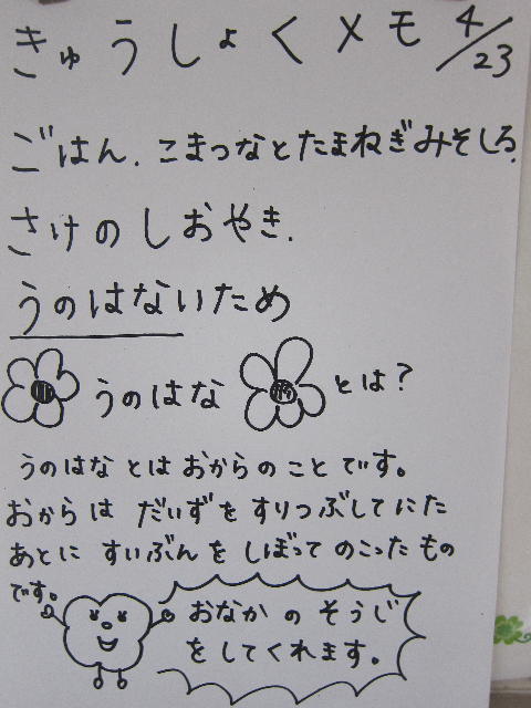 今日は私の向かいの席の子がごはんの上に「うのはないため」を乗せたおから丼、隣の子がほぐした鮭をごはんに混ぜた鮭フレーク丼にして食べていました。