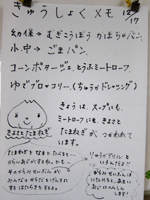 本日の「コーンスープ」と「豆腐ミートローフ」に清里産の玉ねぎが使われているそうです。