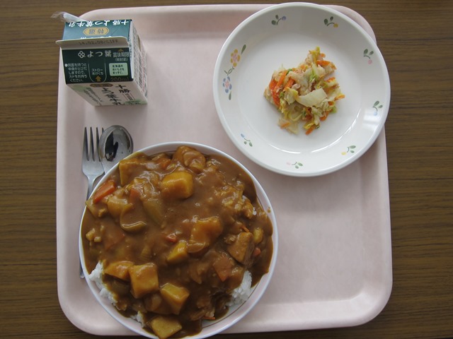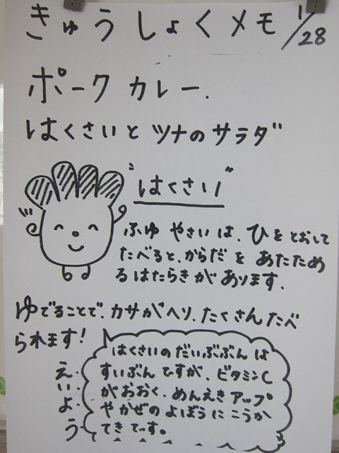 ポークカレー 白菜とツナのサラダ きゅうしょくメモに白菜のことが書かれていました。 白菜の大部分は水分だそうです。 文責:とも