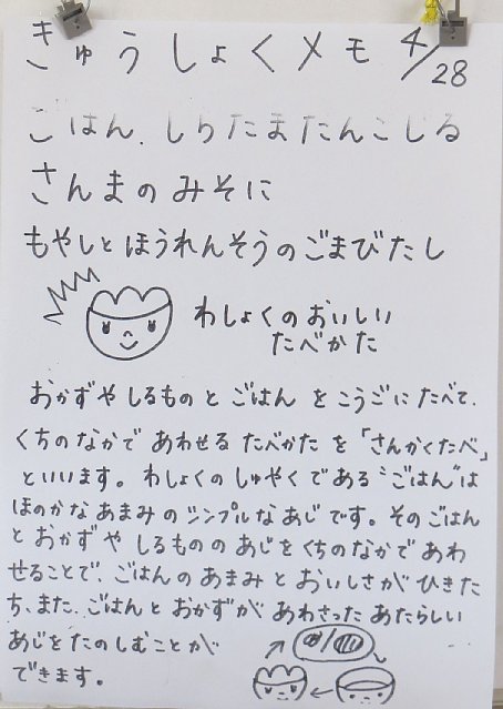 給食調理員さんからは、「三角食べ」についてのお話が。ご飯とおかず、汁物をバランスよく交互に食べることで、和食の楽しみ方が広がります、とのことでした。ご家庭でご飯を食べる時も、この「三角食べ」、きちんとできているでしょうか…?是非食事の時にでも、話題にしてみてくださいね。