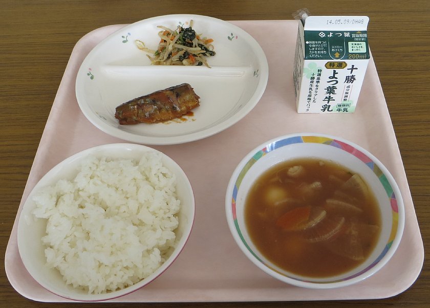 白玉と、大根、ニンジン、しいたけ、鶏肉などたくさんの具が入った白玉団子汁に、骨まで食べられるさんまの味噌煮、ゴマの香りとちょっと甘めの味付けがおいしいゴマびたしと、ご飯にとてもよく合うおかずでした。