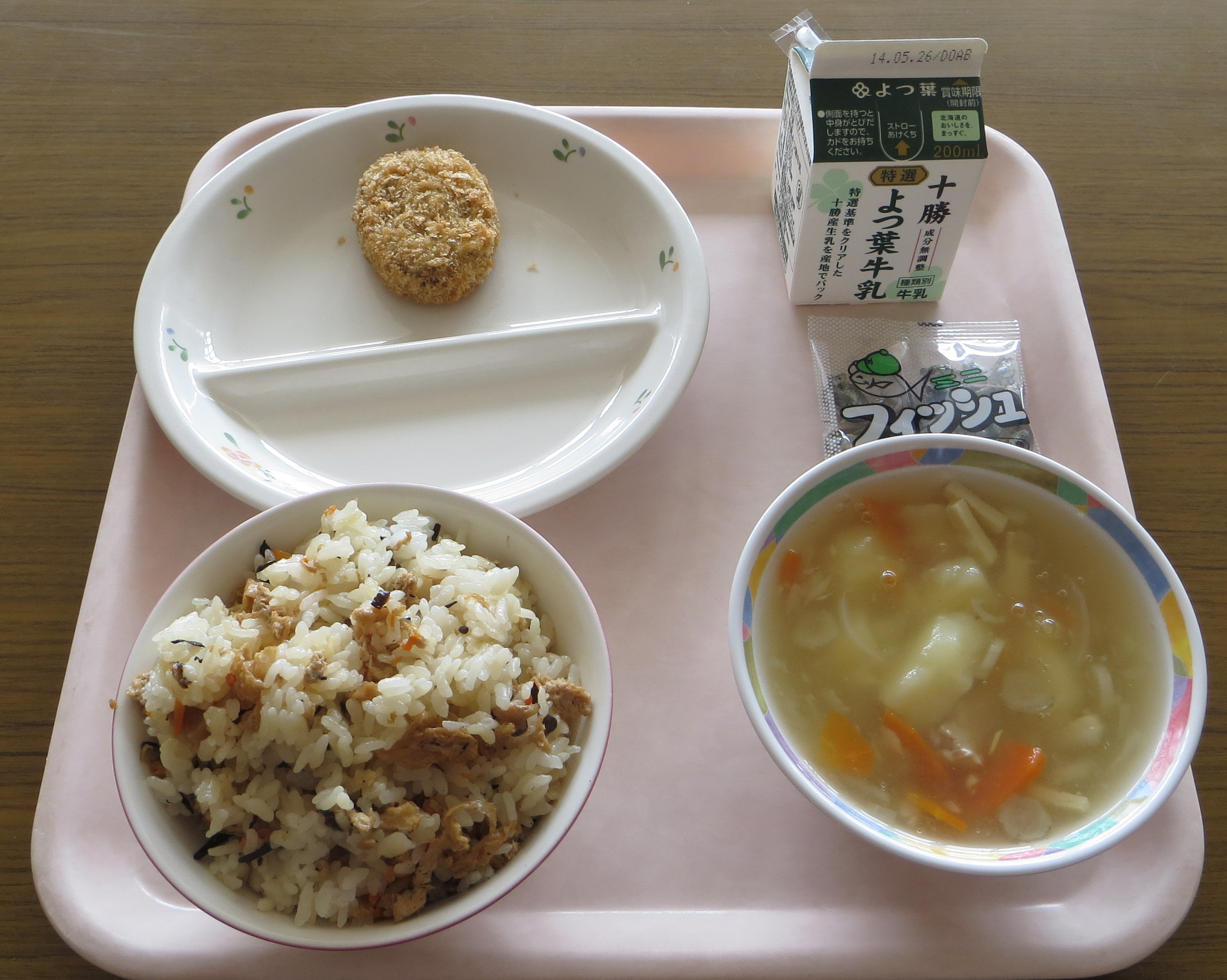 油揚げでご飯を包むお稲荷さんではなく、細かく刻んだ油揚げをご飯に混ぜ込んだ炊き込みいなり。何故かこれにミニフィッシュを混ぜて食べている子も…。フィッシュの甘さと酢飯の酸っぱさがちょうどあうのかな…?