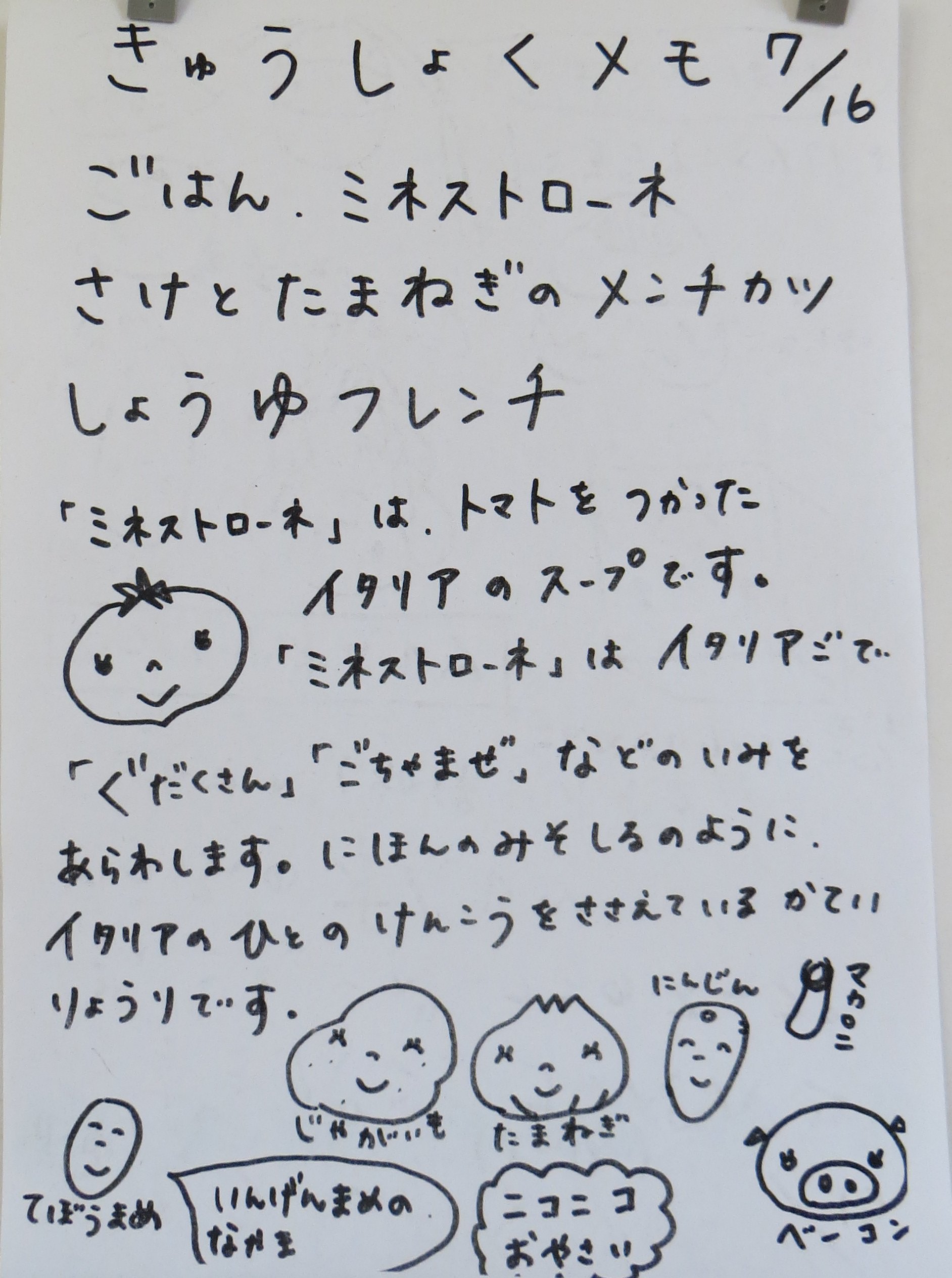 イタリア料理のミネストローネ。トマトや玉ねぎ、ニンジン、ジャガイモ、てぼうまめ、マカロニ、ベーコンがたっぷり入った、まさに「食べるスープ」です。野菜がたくさん食べられるので、体にもいいですね。