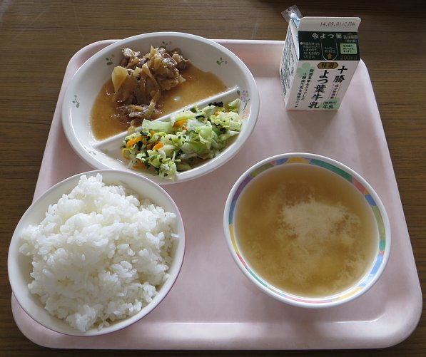 今日の体を温めてくれる汁物は五目味噌汁!美幌産の大根とキャベツに北見産玉ねぎ、斜里産のゴボウとニンジンが入った味噌汁です。出汁の香りと野菜の甘さがおいしいお味噌汁でした。