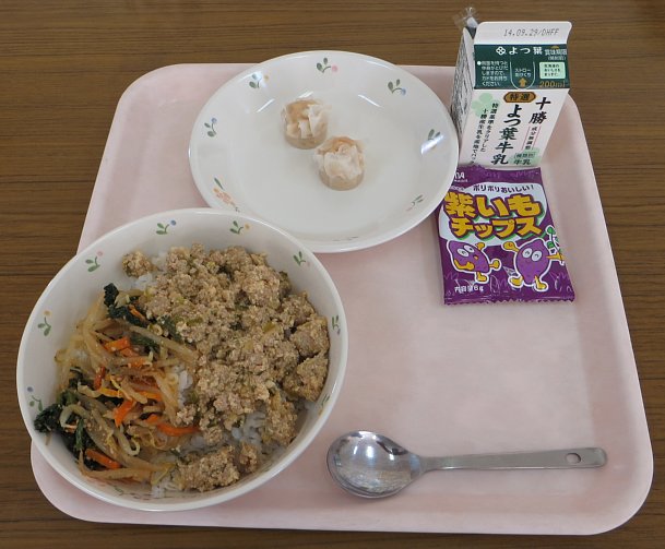 おかずはえびシュウマイ。ちょっと脂っぽくなった口の中がさっぱりします。それに紫いもチップスもついてお腹いっぱいなお昼でした。