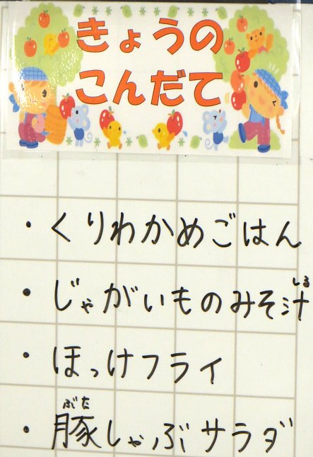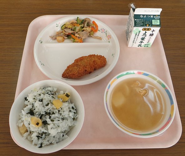 今日のご飯は栗わかめご飯!秋といえば栗!、と思われる方もいらっしゃるのではないでしょうか?栗は、古くは縄文時代から食べられていたそうで、それだけ日本人には馴染みの食べ物ということになりますね。今日の栗わかめご飯、わかめの塩味が栗の甘さを際立たせています。