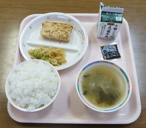 味噌汁の具は大根とわかめ。定番ですね。それにキャベツのゴマびたしもついて、「これぞ和食!」といった感じの給食でした。