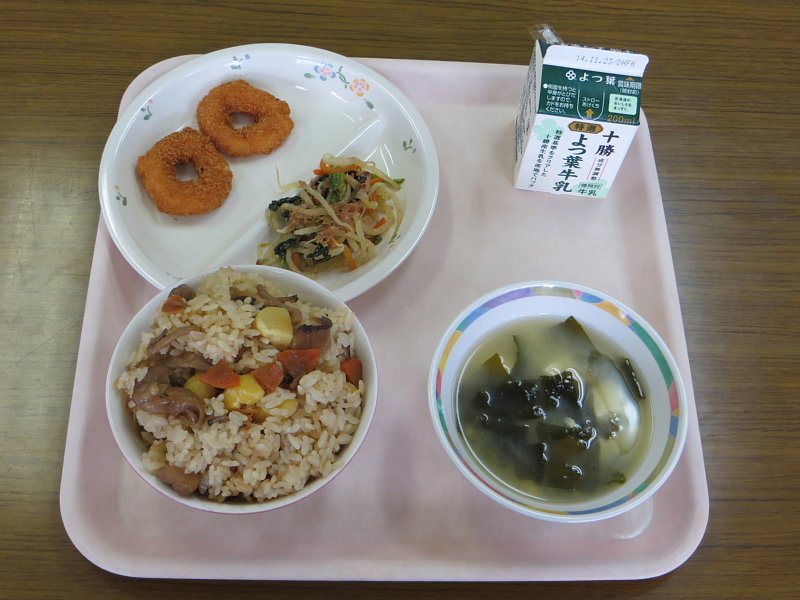 今日の給食は、秋らしくくり五目ごはん!五目ごはんの旨味と栗の甘さが合わさって、「食欲の秋」にふさわしいご飯となっています。