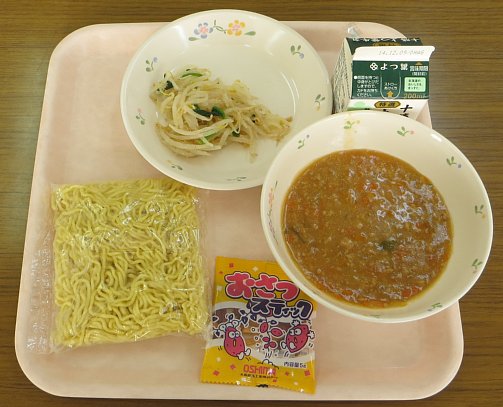 ジャージャー麺というと、麺の上に肉みそを乗せるものですが、肉みそのあんの中に麺を入れるのが給食スタイル。あんをたっぷりと絡めて食べます。ぴりっとした辛さが食欲をそそりますね。