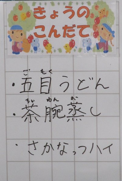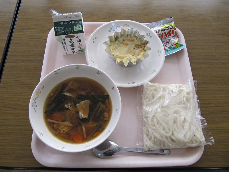 今日は金曜、麺の日です!メニューは五目うどん。緑の時間にはリンク開き、続いて3時間目にはスケートの学習がありましたので、1時間以上外に出っぱなしでした!そんな疲れて冷えた体には、暖かいうどんがうれしいですね。