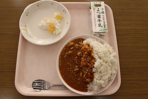 普段の給食では結構な量の残食が出てしまうこともあり、どうやって残食を減らしていくかが給食指導上頭を悩ましている所なのですが、今日は麦ごはん、フルーツのヨーグルト和え共に完食!さすがにカレーは少し残ってしまいましたが、いつも以上に残食の量は少なくて済みました。やはりカレーの威力は大きいですね。